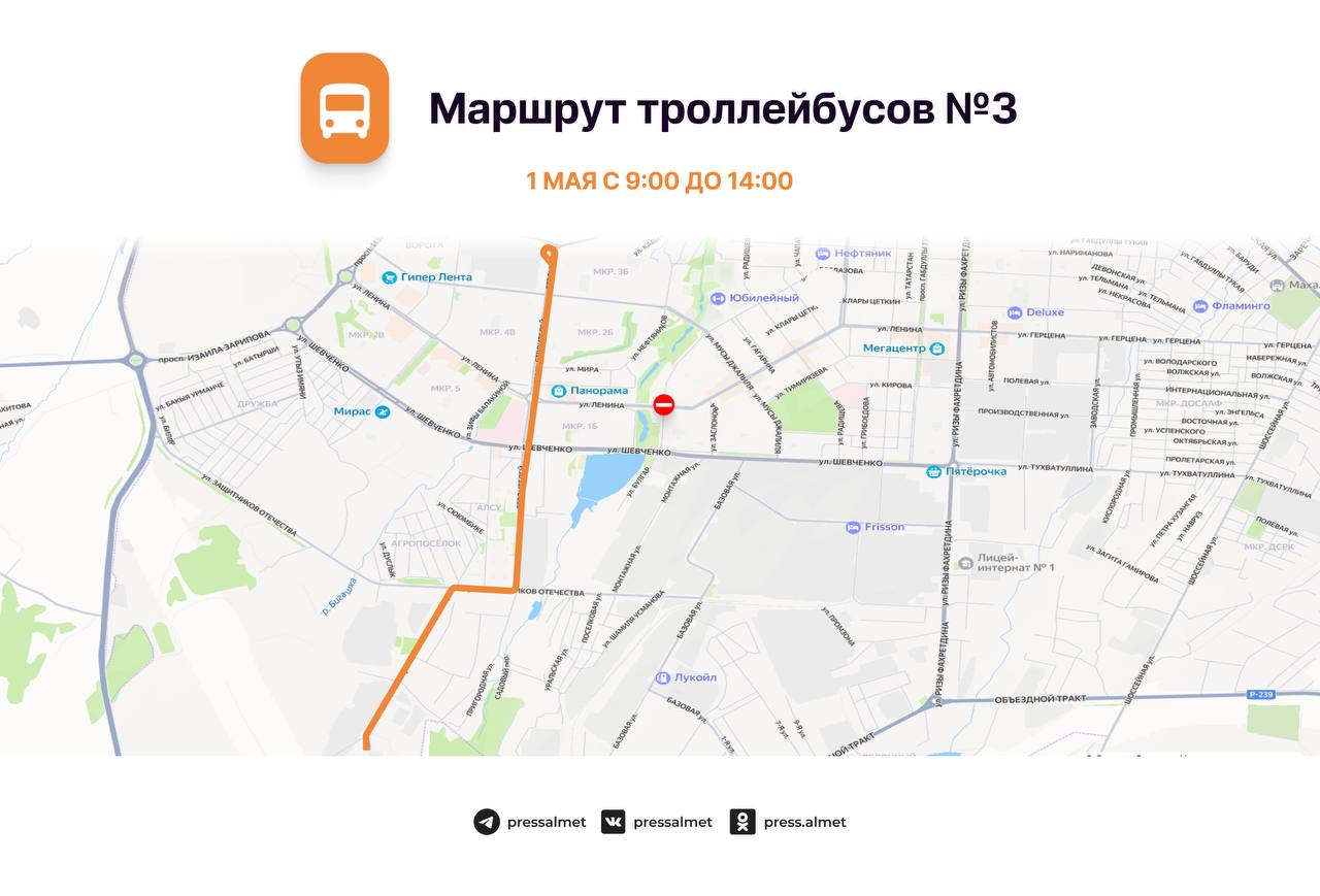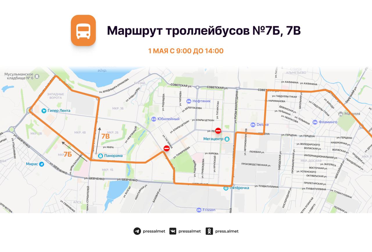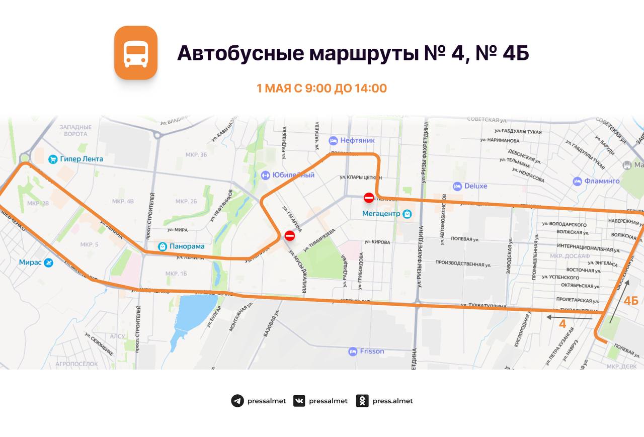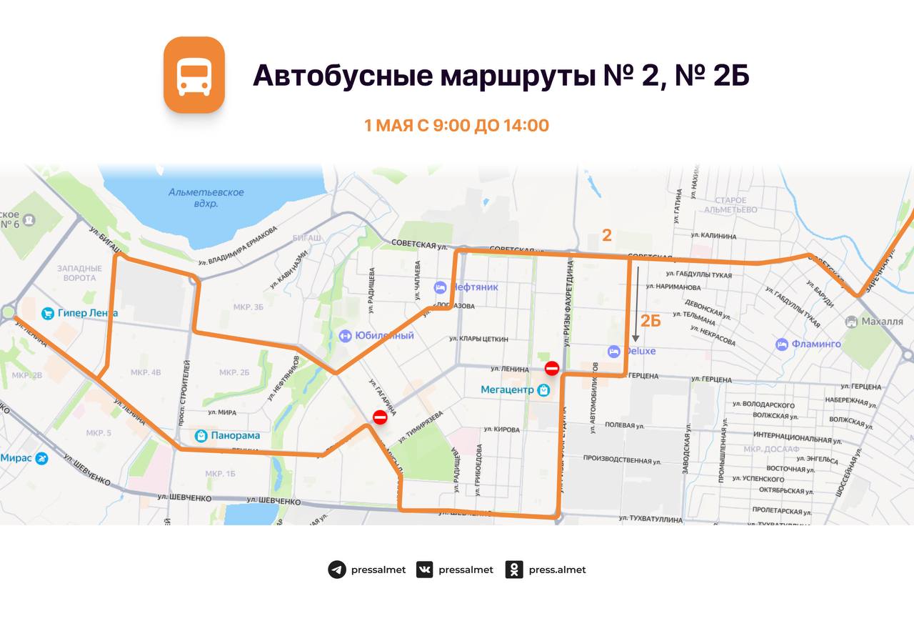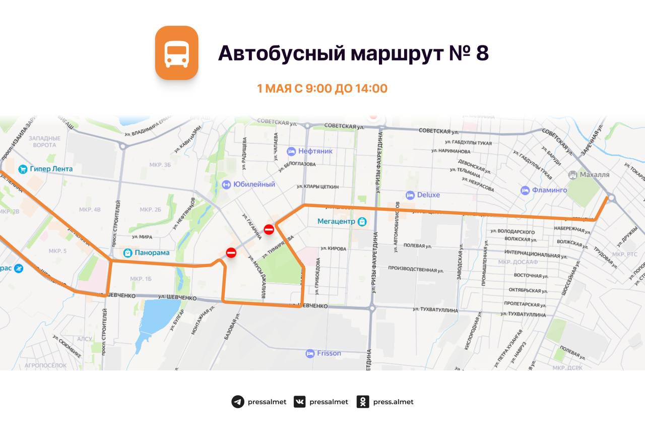 1 майда, Әлмәттә 65 нче җиңел атлетика эстафетасы уздырылу сәбәпле, 09:00 сәгатьтән 14:00 сәгатькә кадәр Ленин урамында М.Җәлил урамыннан Г. Тукай проспектына кадәр транспорт хәрәкәте, шулай ук Гагарин, Радищев, Пушкин, Чехов, Островский һәм Маяковский урамнарыннан Ленин урамына чыгу юллары ябылачак.